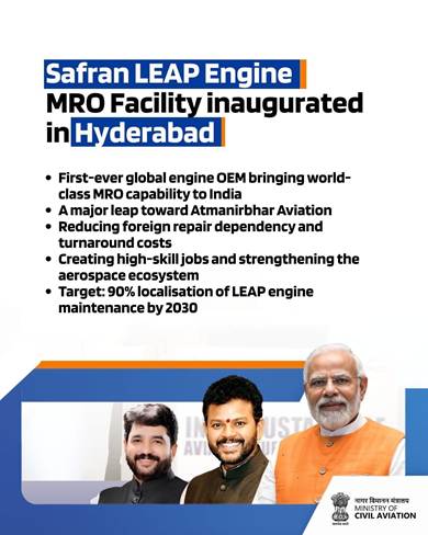 A major boost to India’s aerospace self-reliance has been achieved achieved. A newly inaugurated Safran LEAP Engine MRO facility in Hyderabad brings world-class maintenance capability to our shores, reduces foreign dependency, creates high-skill jobs, and accelerates our journey toward Aatmanirbhar Aviation. Operationalisation of Safran Aircraft Engine Services, Hyderabad and Thales’ first Avionics MRO facility in India, significantly expanding onshore maintenance capability and positioning India as a global MRO hub.