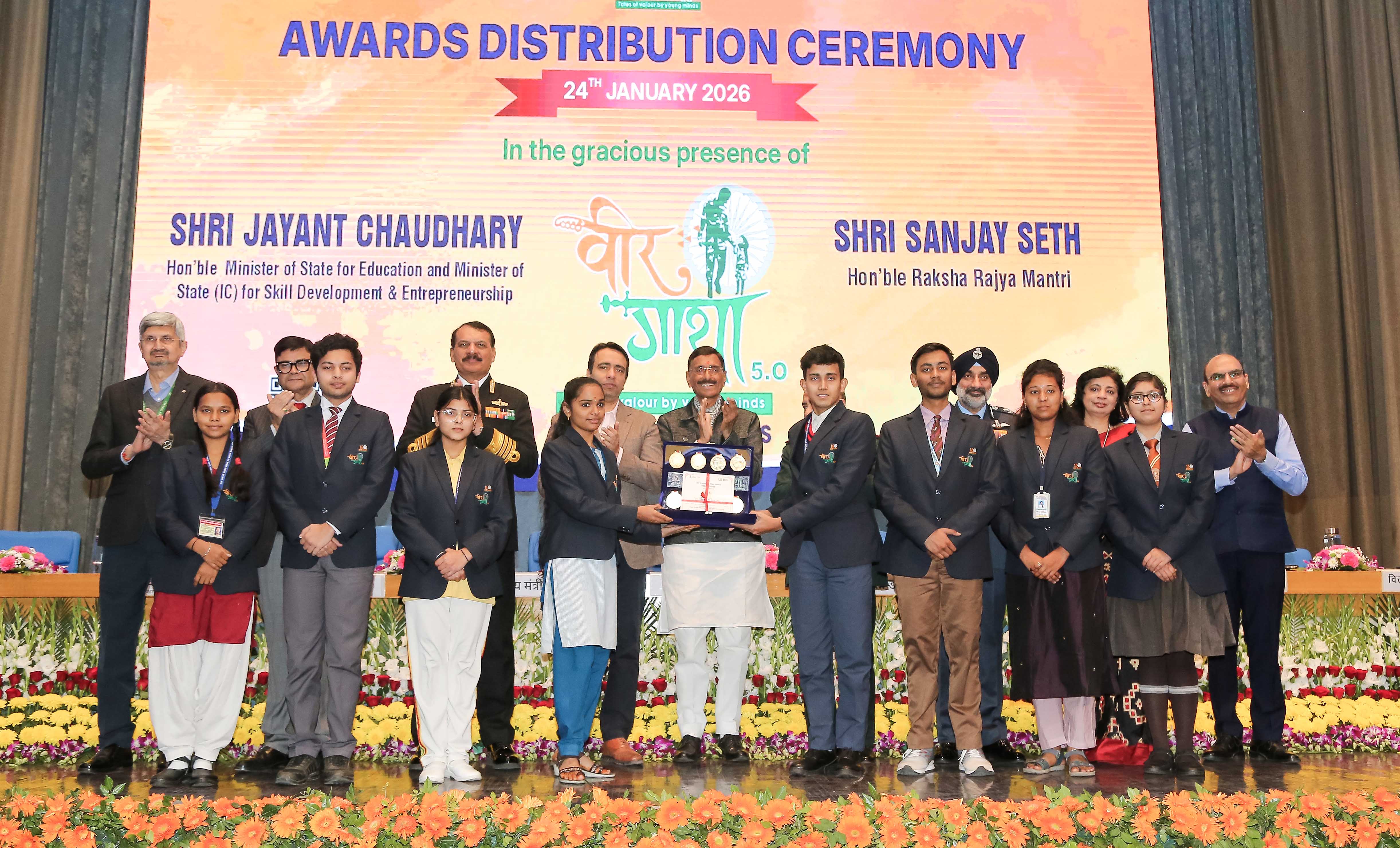 Raksha Rajya Mantri Shri Sanjay Seth and the Minister of State for Education and Skill Development & Entrepreneurship (I/C), Shri Jayant Chaudhary, felicitated the Super-100 winners of Veer Gatha 5.0 in New Delhi on January 24, 2026. For the first time, 28005 international students studying in CBSE schools abroad also took part in the competitions. Among the 100 winners, 64 are girls from different parts of the country. Each winner was presented with a cash prize of Rs. 10,000, a medal and a certificate. These Super-100 are among the special guests who will be witnessing the Republic Day Parade at Kartavya Path on January 26, 2026.
