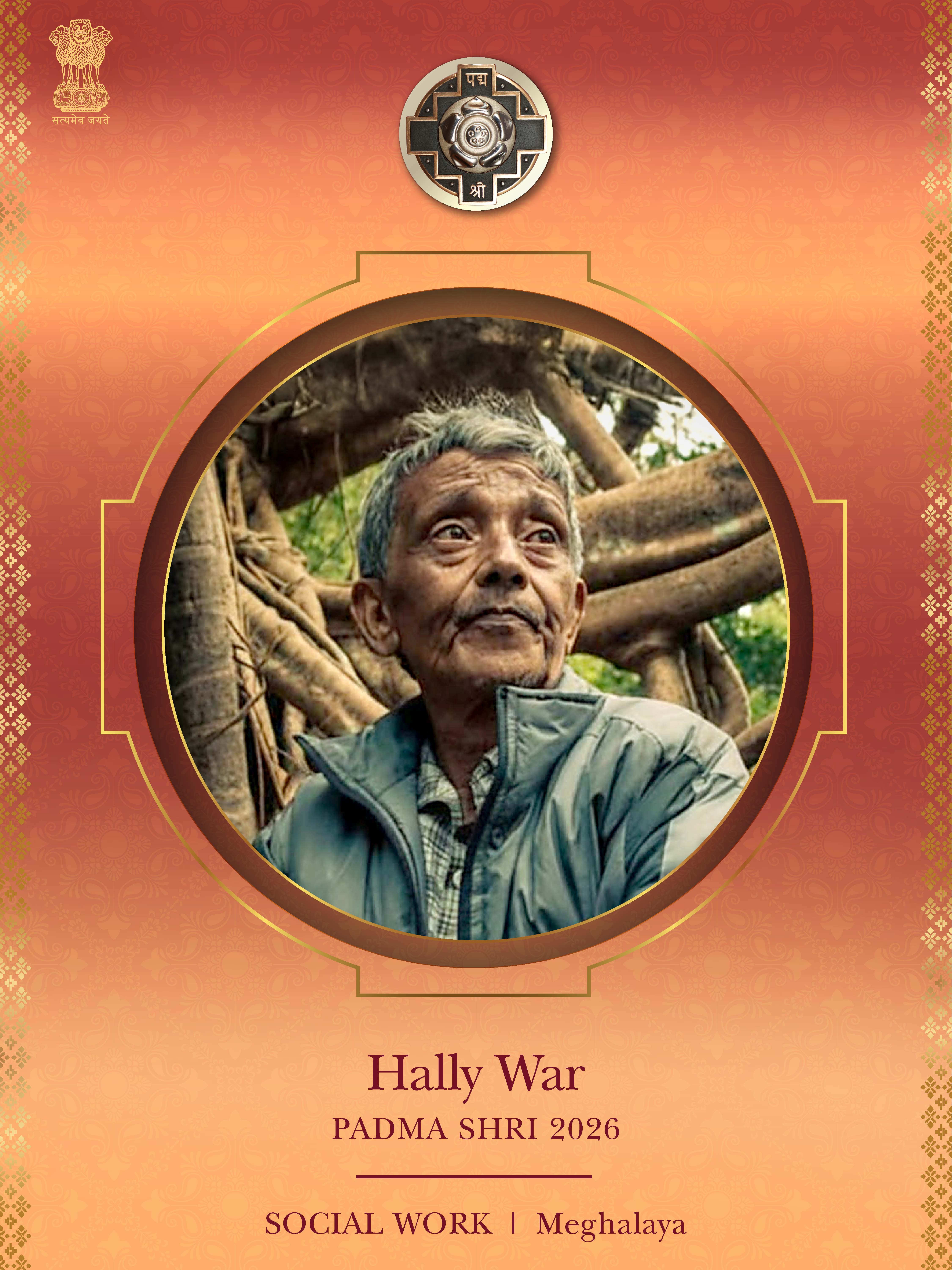 Shri Hally War of Siej village, Sohra, Meghalaya has been conferred the Padma Shri Award 2026 for his contribution to social work and environmental conservation, particularly in the field of afforestation and preservation of indigenous practices.