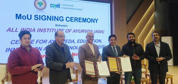 AIIA Director Prof. (Vd.) P. K. Prajapati signed the MoU on behalf of AIIA, while Prof. Dr. Abhimanyu Kumar, Chairman & CEO, Centre for Ayurveda Education, Innovation & Technology (CAYEIT), signed on behalf of CAYEIT.