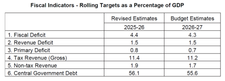 Union Budget 2026-27 has as its fiscal anchor the debt glide path indicated in Budget 2025-26 and Budget 2024-25 (regular) and is being presented against the backdrop of ongoing fiscal consolidation announced in FY 2021-22, which has provided a good foundation for making available the resources required to balance the development priorities without compromising on fiscal prudence. As announced in Budget 2021-22, the Government made true its intention of reaching a fiscal deficit below 4.5 per cent of GDP in FY 2025-26. Going ahead, it would be the Endeavour of the Government to adopt a fiscal stance that would put the Central Government debt on a declining path. Major fiscal indicators of the Union Government in the Revised Estimates (RE) of FY 2025-26 and the Budget Estimates (BE) of FY 2026-27 as a per cent of GDP, are summarized in the table below.