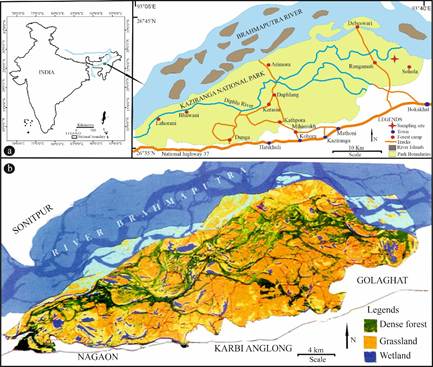 Fig 1: a. Location map of the sampling site, b. Vegetation coverage map of the Kaziranga National Park (after Das et al., 2014).
