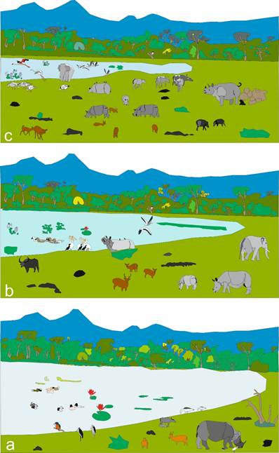 Fig 2: A model (schematic view) of palaeovegetation and palaeoherbivory activities in the KNP, a. Dense forest with wider and swamp condition with low wildlife activities, b. Relatively less dense and less deep water with increased wildlife activities, c. Comparatively more less dense forest and less deep swamp with more increased wildlife activities within KNP.