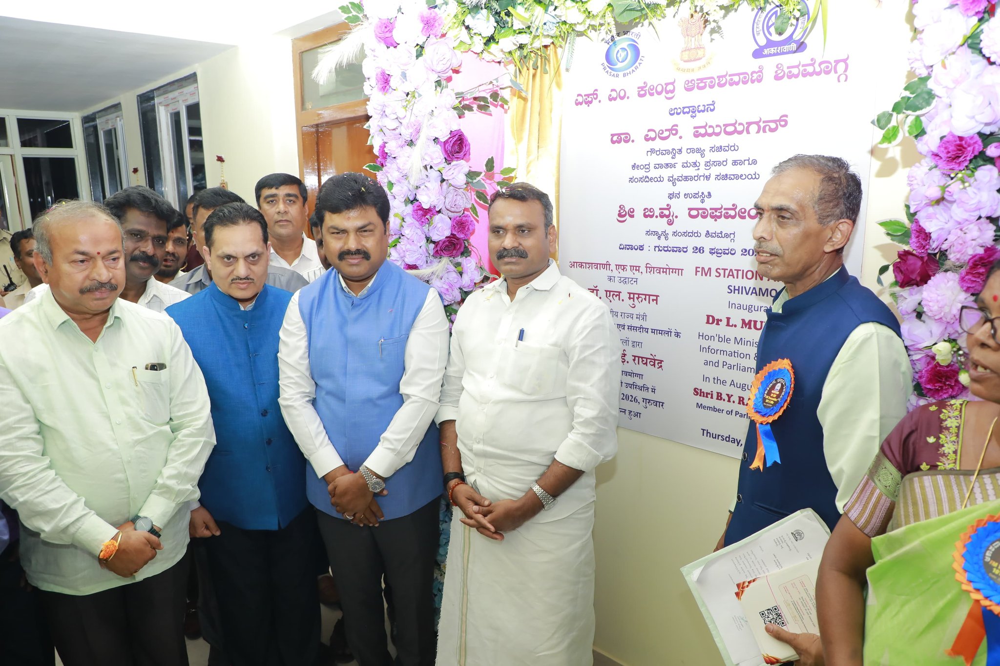 Dr. L. Murugan, Hon’ble Union Minister of State for Ministry of Information and Broadcasting, today inaugurated the 10 kW FM transmitter station established by Prasar Bharati at Vidyanagar in Shivamogga. On this occasion, Shri B.Y. Raghavendra, Member of Parliament for Shivamogga Lok Sabha constituency and others were present.