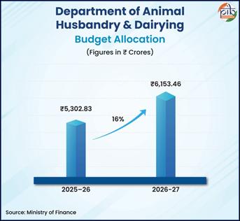 Between FY15 and FY24, the sector’s Gross Value Added (GVA) increased by nearly 195 percent, reflecting a compound annual growth rate (CAGR) of 12.77 percent at current prices. In the Union Budget 2026–27, ₹6,153.46 crore has been allocated to the Department of Animal Husbandry & Dairying, reflecting a 16 percent increase from ₹5,302.83 crore in FY 2025–26. This expansion underscores the sector’s role in income diversification and livelihood resilience, supported by investments in breed improvement, veterinary infrastructure, and disease control.