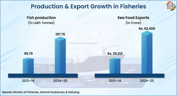 Deep-sea and offshore fisheries further integrate India into global seafood value chains, strengthening the sector’s economic and food security importance. This integration has been reinforced through focused interventions under the Pradhan Mantri Matsya Sampada Yojana (PMMSY) and Pradhan Mantri Matsya Kisan Samridhi Sah-Yojana (PM-MKSSY), under which seafood exports have more than doubled from ₹30,213 crore in 2013–14 to ₹62,408 crore in 2024–25, reaching over 130 countries.