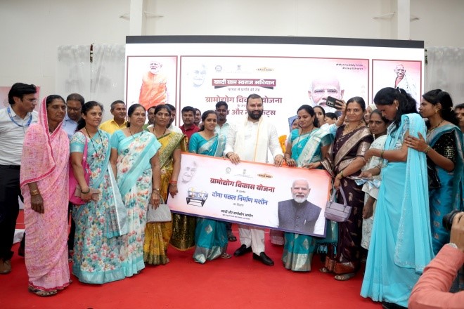 With an aim to effectively implement Prime Minister Shri Narendra Modi’s vision of ‘Developed India @ 2047’, ‘Aatmanirbhar Bharat’, ‘Make in India’ and ‘Made for the World’ at the grassroots level, the Khadi and Village Industries Commission (KVIC), Ministry of Micro, Small and Medium Enterprises, Government of India organised a large-scale machine and toolkit distribution programme at, Khambale, Nashik today. The Chief Guest of the programme, Chairman, KVIC, Shri Manoj Kumar, distributed 1,072 machines and toolkits to 600 trained artisans engaged in various village industry activities under the Gramodyog Vikas Yojana (GVY). In addition, under the Prime Minister’s Employment Generation Programme (PMEGP), margin money subsidy amounting to ₹42.61 crore was distributed online to 1,367 beneficiaries, generating employment for more than 15,000 people.