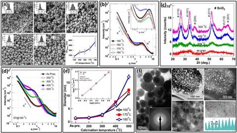 Fig 2 : (a) SEM micrographs showing the morphology of as-prepared beads synthesized at different solvothermal temperatures; (b) SAXS profiles of the as-prepared beads; (c) XRD patterns of beads after heat treatment at various temperatures; (d) SAXS profiles of heat-treated beads highlighting changes in microstructure; (e) Primary particle size as a function of calcination temperature, with the inset depicting Ostwald ripening behavior of beads calcined at 500°C for varying durations; (f) TEM images illustrating the hierarchical structure of beads at different length scales.