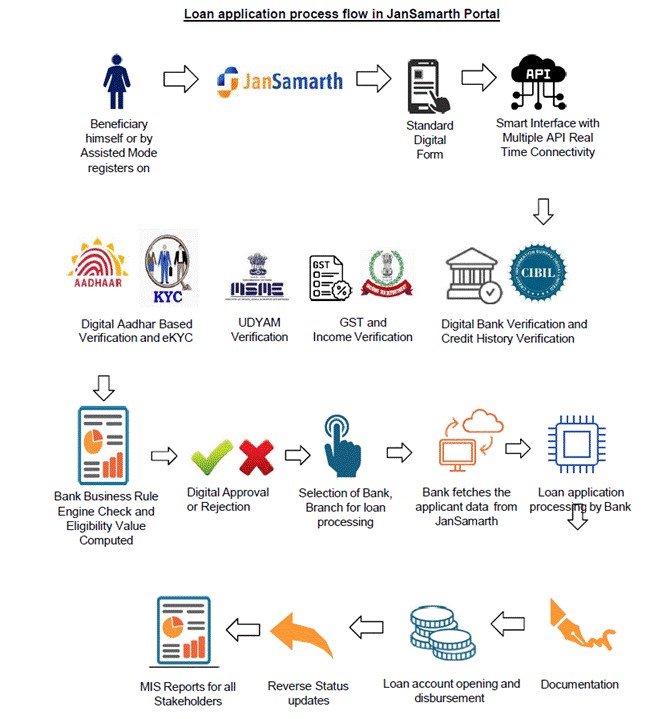 JanSamarth portal is a digital marketplace with front-end user interface for beneficiaries, integrated with wide range of centralized data sources. Use of the “JanSamarth” Portal by applicants eases the loan application and disbursement process as the applicant can upload his application and the rule engine for approval of the applications is inbuilt. This will save time and effort as applicant can apply for a loan on the portal which is available on 24/7 basis.
