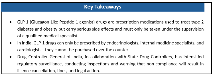- On 10th March 2026, a comprehensive advisory was issued to all drug manufacturers to stop misleading advertisements and any promotion that could encourage people to use GLP-1 drugs without a prescription.