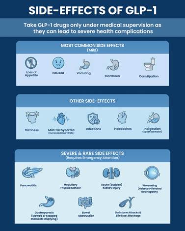 GLP-1 drugs are a significant medical breakthrough in treating type 2 diabetes and obesity, but they are not without risk. The drugs carry a wide range of side effects - from common symptoms like nausea and vomiting to severe complications including pancreatitis, kidney injury, and bowel obstruction. These risks make it essential that GLP-1 drugs are only taken under the supervision of registered medical practitioner/specialists.