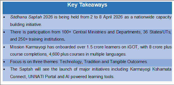 Strengthening Adaptive Development and Humane Aptitude for National Advancement (Sādhana) Saptah 2026 is being organised from 2 to 8 April 2026 as one of the largest collaborative capacity building initiatives in India, that aims to foster skills necessary for citizen centric governance. Organised by the Department of Personnel and Training, Capacity Building Commission and Karmayogi Bharat, the initiative brings together Central Ministries, States and Union Territories, and training institutions on a common platform to promote responsive and citizen centric governance. The initiative, with the tagline “Ham Bane Karmayogi”, also marks the Foundation Day of the Capacity Building Commission and five years of Mission Karmayogi.