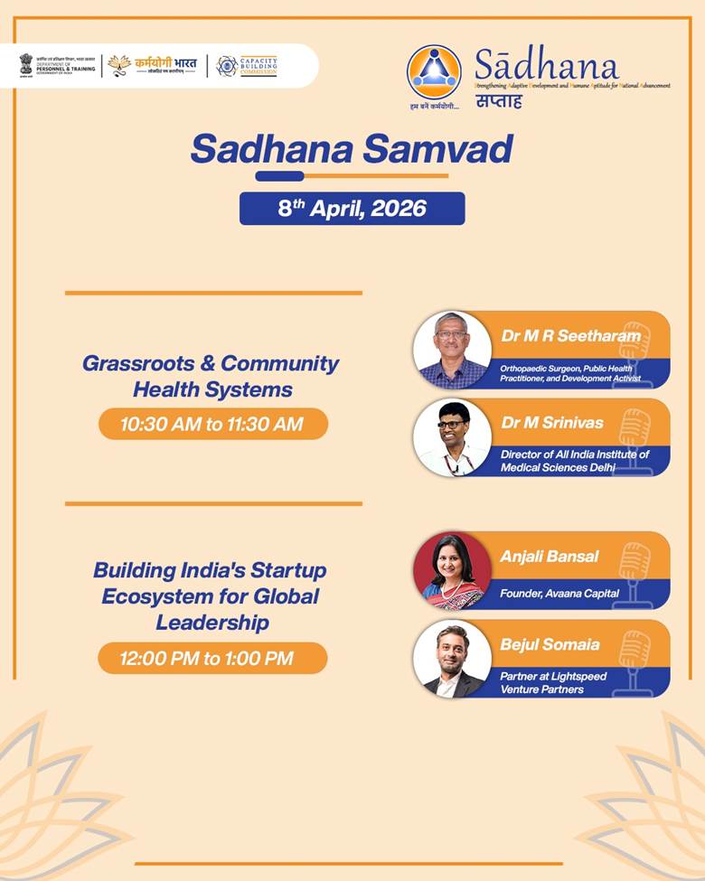 The Seventh day of Sādhana Saptah 2026 focuses on Tangible Outcomes, with expert-led webinars scheduled for 8 April 2026. The sessions will explore grassroots healthcare systems and India's startup ecosystem for global leadership.