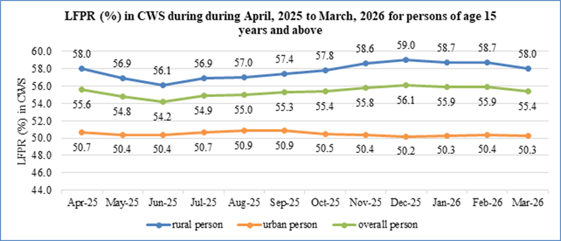 The overall LFPR among persons of age 15 years and above reported as 55.4% in March, 2026. Rural LFPR was 58.0% in March, 2026 as compared to 58.7% in February, 2026 while urban LFPR remained almost stable during this period.