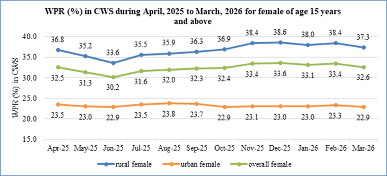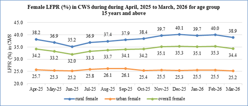 Female Labour Force Participation Rate (LFPR) in March, 2026 was reported as 34.4%, against 35.3% in February, 2026. Female LFPR in rural areas was found as 38.9% in March, 2026, while the same stood at 25.2% in urban areas during the month.