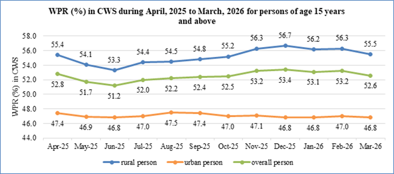 - The overall WPR (15+ years) stood at 52.6% in March, 2026.
