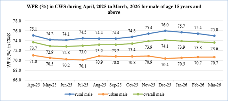 The Worker Population Ratio (WPR) in the age group 15 years and above remained broadly stable in urban areas in March, 2026. The overall WPR was estimated at 52.6% in March, 2026. In rural areas, WPR stood at 55.5% in March, 2026 as compared to 56.3% in February, 2026 while WPR in urban areas observed as 46.8% in March, 2026, against 47.0% in February, 2026.