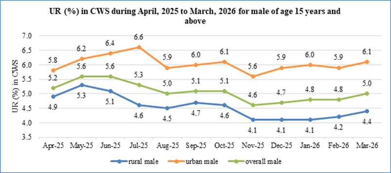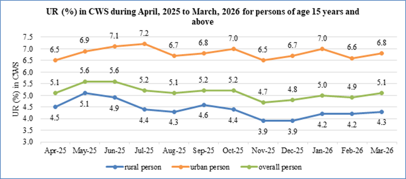 The UR among persons of age 15 years and above rose slightly to 5.1% in March, 2026 from 4.9% in February, 2026 mainly driven by urban UR which edged up from 6.6% in February, 2026 to 6.8% in March, 2026.