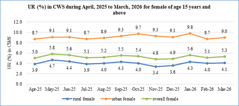 Among rural female aged 15 years and above, the UR remained almost stable in March, 2026, whereas the male UR in the same age group was marginally high in March, 2026 in comparison to February, 2026.