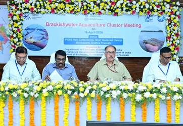 Dr. Abhilaksh Likhi, Secretary, Department of Fisheries, Ministry of Fisheries, Animal Husbandry and Dairying (MoFAH&D), Government of India, chaired a review meeting in Bhimavaram on 16th April 2026 to review the progress of Brackishwater Aquaculture Cluster notified under PMMSY and interact with shrimp farmers engaged in Brackish water aquaculture in the region. During the visit, the Union Secretary also interacted with shrimp and fish farmers. to understand the gaps and challenges faced on ground. The review meeting was held in a hybrid mode and saw participation from officials from the Department of Fisheries, Government of India and the Department of Fisheries, Government of Andhra Pradesh, representatives of fisheries clusters from States and Union Territories, scientists from ICAR fisheries institutes, and representatives of NFDB, CAA, MPEDA, NABARD, fish farmers, shrimp farmers, fisheries cooperatives, Seafood Exporters, Fisheries universities and Fisheries colleges.
