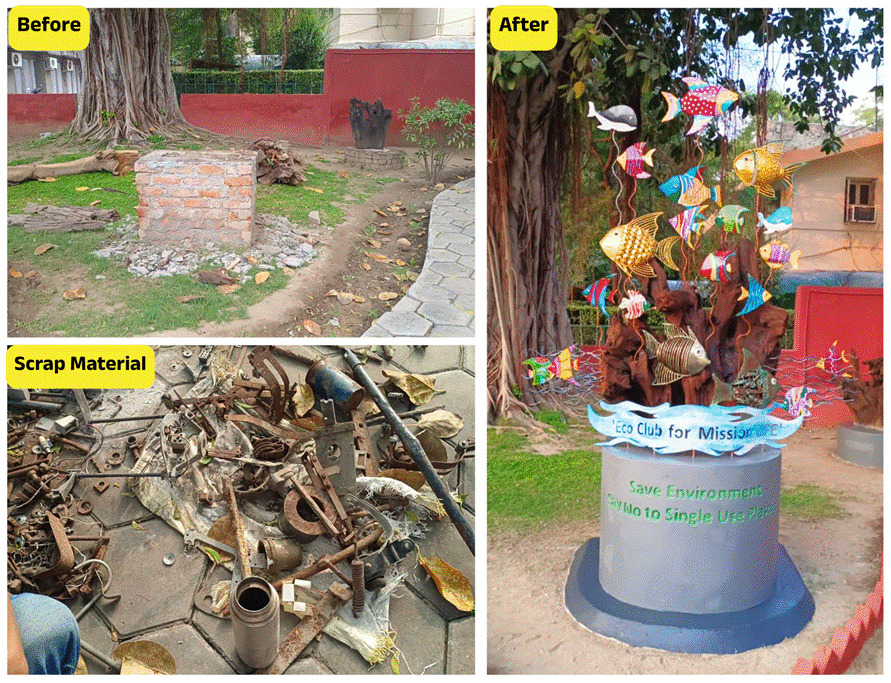 - An innovative installation made from scrap materials has been created at National Bal Bhavan under the aegis of Eco Club for Mission LiFE. Using discarded wood, iron rods, nuts, bolts and cement, the artwork showcases the spirit of sustainability and creative reuse. It stands as a symbol of environmental consciousness and the commitment of school students to a cleaner, greener future.