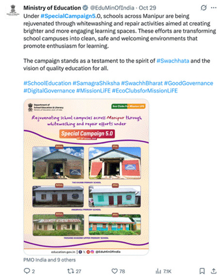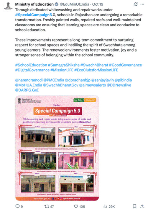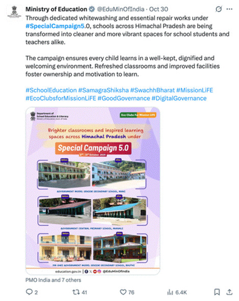 Department of School Education & Literacy (DoSEL), Ministry of Education, successfully concluded Special Campaign 5.0, observed from 2nd October to 31st October 2025, with significant progress in promoting cleanliness, efficiency and environmental awareness across schools and related government offices nationwide.