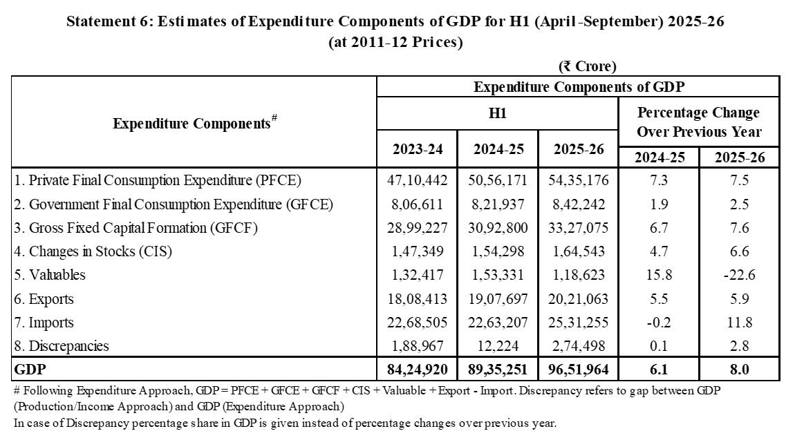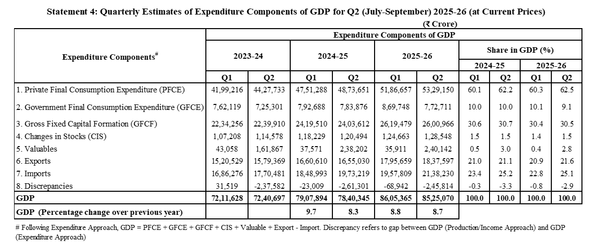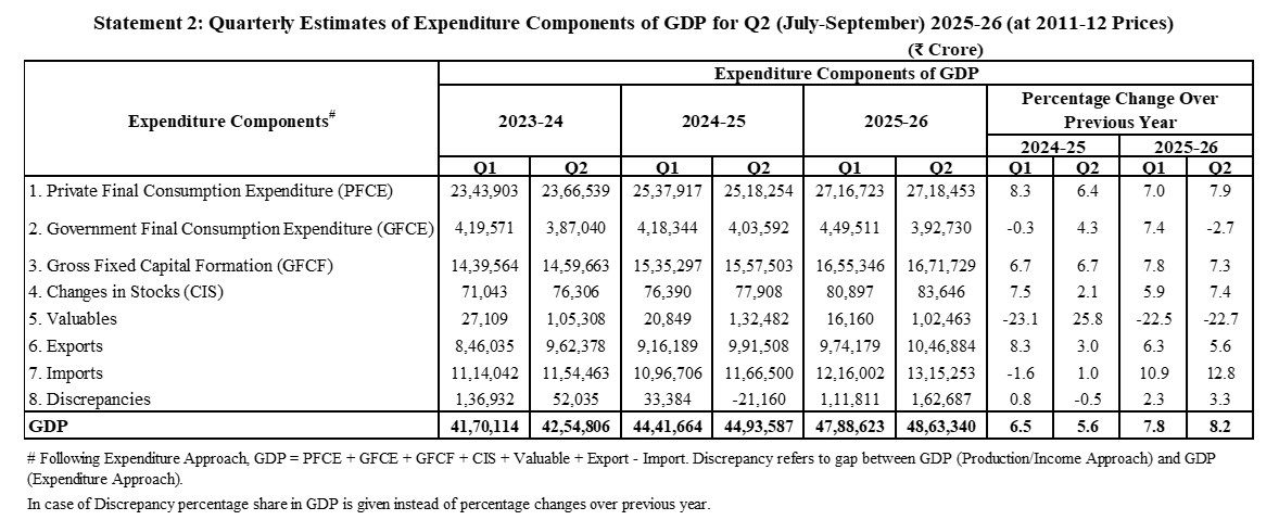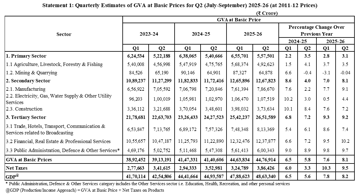 The National Statistics Office (NSO), Ministry of Statistics and Programme Implementation (MoSPI) is releasing in this Press Note, the Quarterly Estimates of Gross Domestic Product (GDP) for the July-September Quarter (Q2) of Financial Year (FY) 2025-26 along with its Expenditure components both at Constant (2011-12) and Current Prices. Quarterly and Half-Yearly (April-September) Estimates of Gross Value Added (GVA) at Basic Prices for various economic sectors along with Year-on-Year percent changes as well as Expenditure components of GDP in respect of FY 2023-24, 2024-25 and 2025-26 at Constant and Current Prices are given in Statements 1 to 8 of Annexure A.