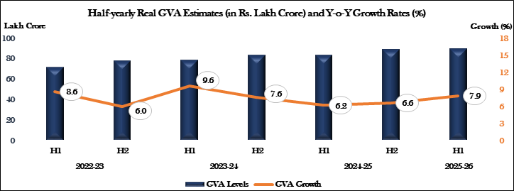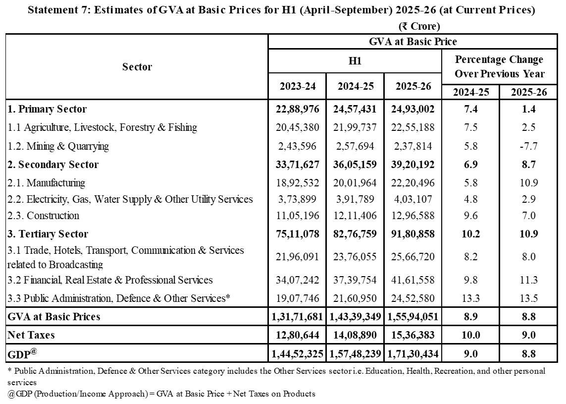 Real GVA in H1 of 2025-26 is estimated at ₹89.41 lakh crore, against ₹82.88 lakh crore in H1 of 2024-25, registering a growth rate of 7.9%. Nominal GVA in H1 of 2025-26 is estimated at ₹155.94 lakh crore, against ₹143.39 lakh crore in H1 of 2024-25, showing a growth rate of 8.8%.
