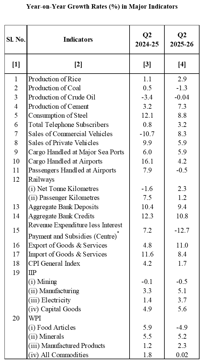 The sector-wise estimates have been compiled using indicators, such as (i) Crop production targets for Agriculture Year (AY) 2025-26 and First Advance Estimates of Production of Food grains, Oilseeds and other Commercial Crops for AY 2025-26, (ii) Third Advance Estimates of Area & Production of Horticulture crops for AY 2024-25, (iii) Summer Season Estimates of Major Livestock Products for FY 2025-26, (iv) Fish Production estimates for Q2 of FY 2025-26, (v) Financial performance of Listed Companies based on available quarterly financial results of these companies for Q2 of FY 2025-26, (vi) Production of Coal, Crude Petroleum, Natural Gas, Cement and Consumption of Steel, (vii) Index of Industrial Production (IIP), (viii) Net Tonne Kilometres and Passenger Kilometres for Railways, (ix) Air Passenger and Cargo traffic handled at Airports, (x) Cargo traffic handled at Major and Minor Sea Ports, (xi) Sales of Commercial vehicles, (xii) Bank Deposits and Credits, (xiii) Premium related information of Life and Non-Life Insurance Companies, (xiv) Outward Supply of Goods and Services available from GSTN for Q2 of FY 2025-26, (xv) Accounts of Central & State Governments etc. available for the Q2 of 2025-26, (xvi) Goods and Services Tax collection for Q2 of FY 2025-26 etc. Year-on-Year growth rates (%) reflected in the few major indicators used in the estimation are given in the Annexure B.