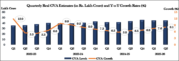 - Real GDP has been estimated to grow by 8.2% in Q2 of FY 2025-26 against the growth rate of 5.6% during Q2 of FY 2024-25.