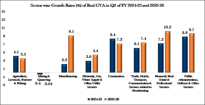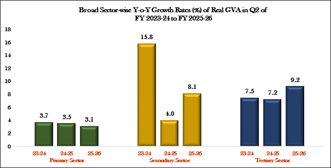 - The Secondary (8.1%) and Tertiary Sector (9.2%) has boosted the Real GDP growth rate in Q2 of FY 2025-26 to rise above 8.0%.
