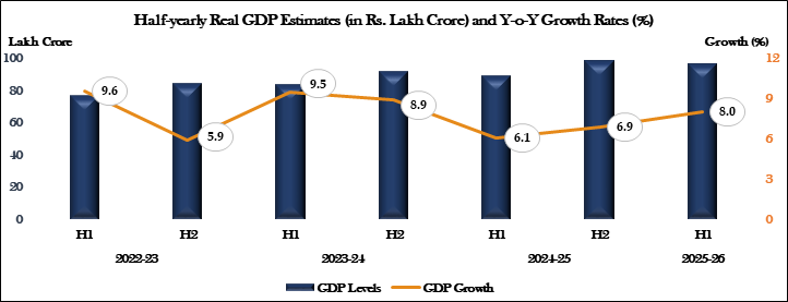 - Real GDP has registered 8.0% growth rate in H1 (April-September) of FY 2025-26, as compared to the growth rate of 6.1% in H1 of FY 2024-25.