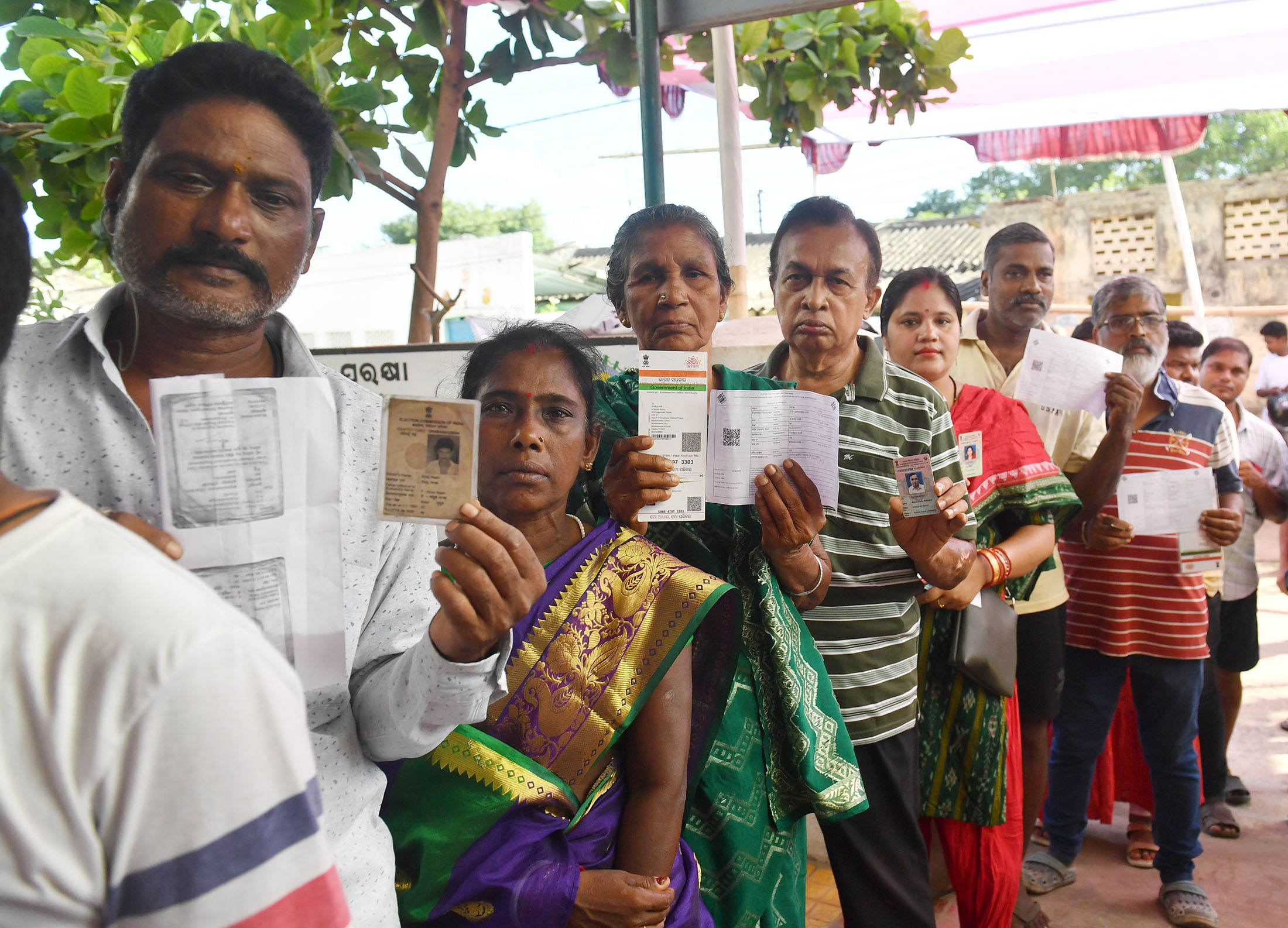 Voters displaying identity cards while standing in queue to cast ...(Photo Id:159331)
