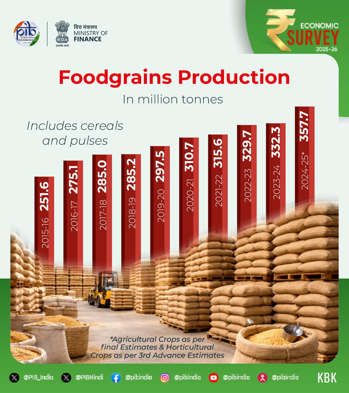 ಕೃಷಿ ಒಳಹರಿವಿನ ಗುಣಮಟ್ಟ, ಕೃಷಿ ಯಾಂತ್ರೀಕರಣ, ಮಾರುಕಟ್ಟೆ ಬೆಂಬಲ, ಬೆಳೆ ವಿಮೆ ಮತ್ತು ಸಾಲದ ಹೆಚ್ಚಳವು ಭಾರಿ ಸಕಾರಾತ್ಮಕ ಫಲಿತಾಂಶಗಳಿಗೆ ಕಾರಣವಾಗುತ್ತದೆ: ಆರ್ಥಿಕ ಸಮೀಕ್ಷೆ