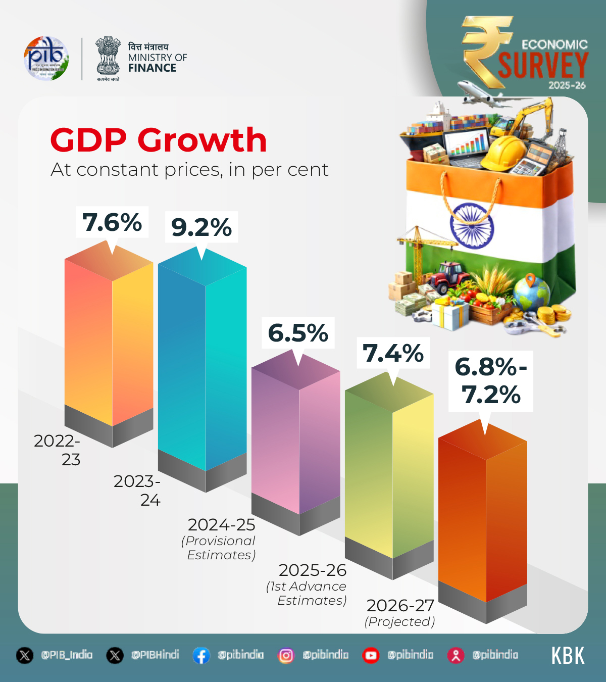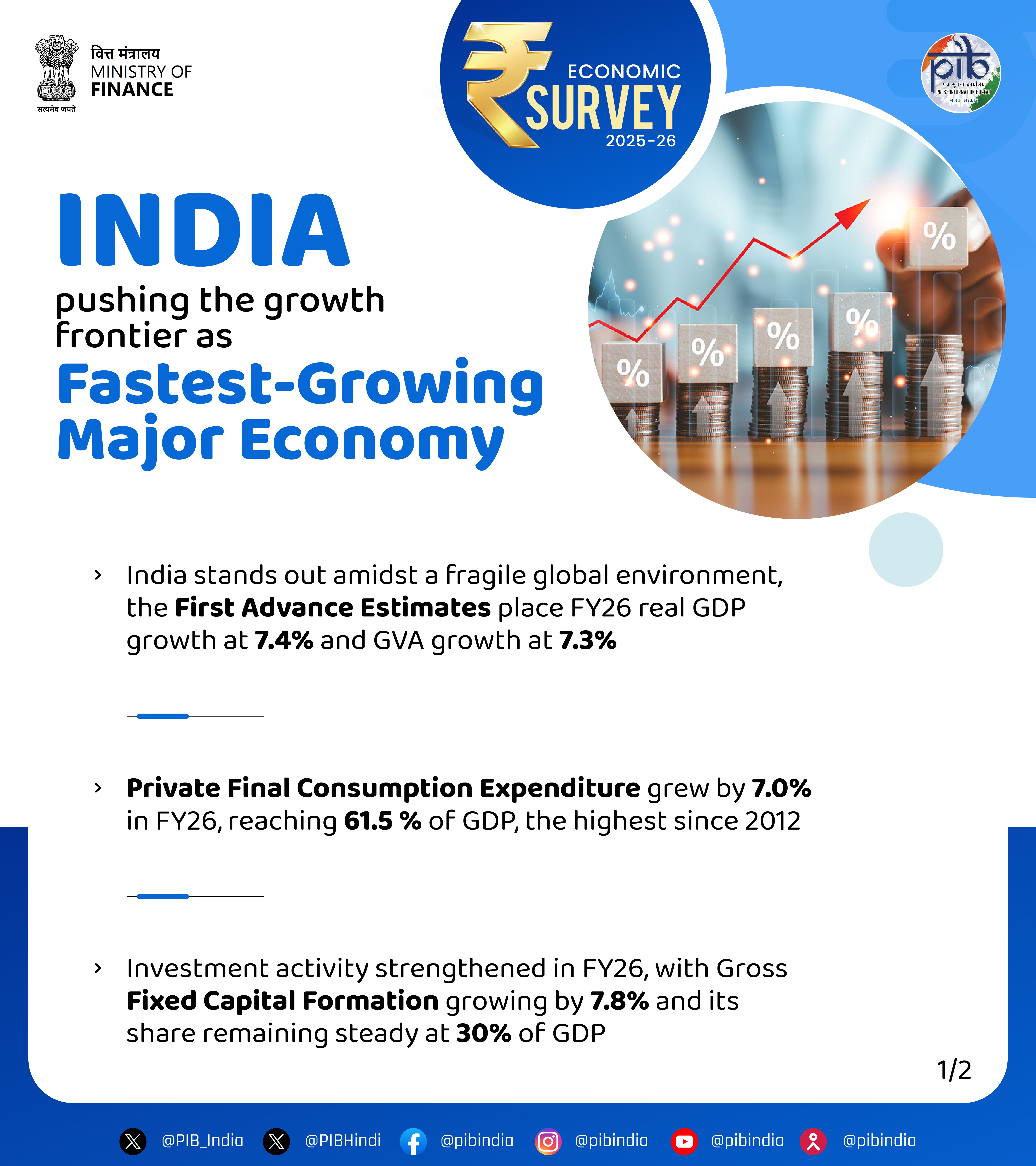 ಹಣಕಾಸು ವರ್ಷ 26ರಲ್ಲಿ ಬಳಕೆ ಮತ್ತು ಹೂಡಿಕೆಯ ಡಬಲ್ ಎಂಜಿನ್ ಗಳಿಂದ ಪ್ರೇರಿತವಾದ ಭಾರತದ ಜಿಡಿಪಿ (GDP) ಬೆಳವಣಿಗೆಯನ್ನು ಶೇ. 7.4 ರಷ್ಟು ಎಂದು ಅಂದಾಜಿಸಲಾಗಿದೆ