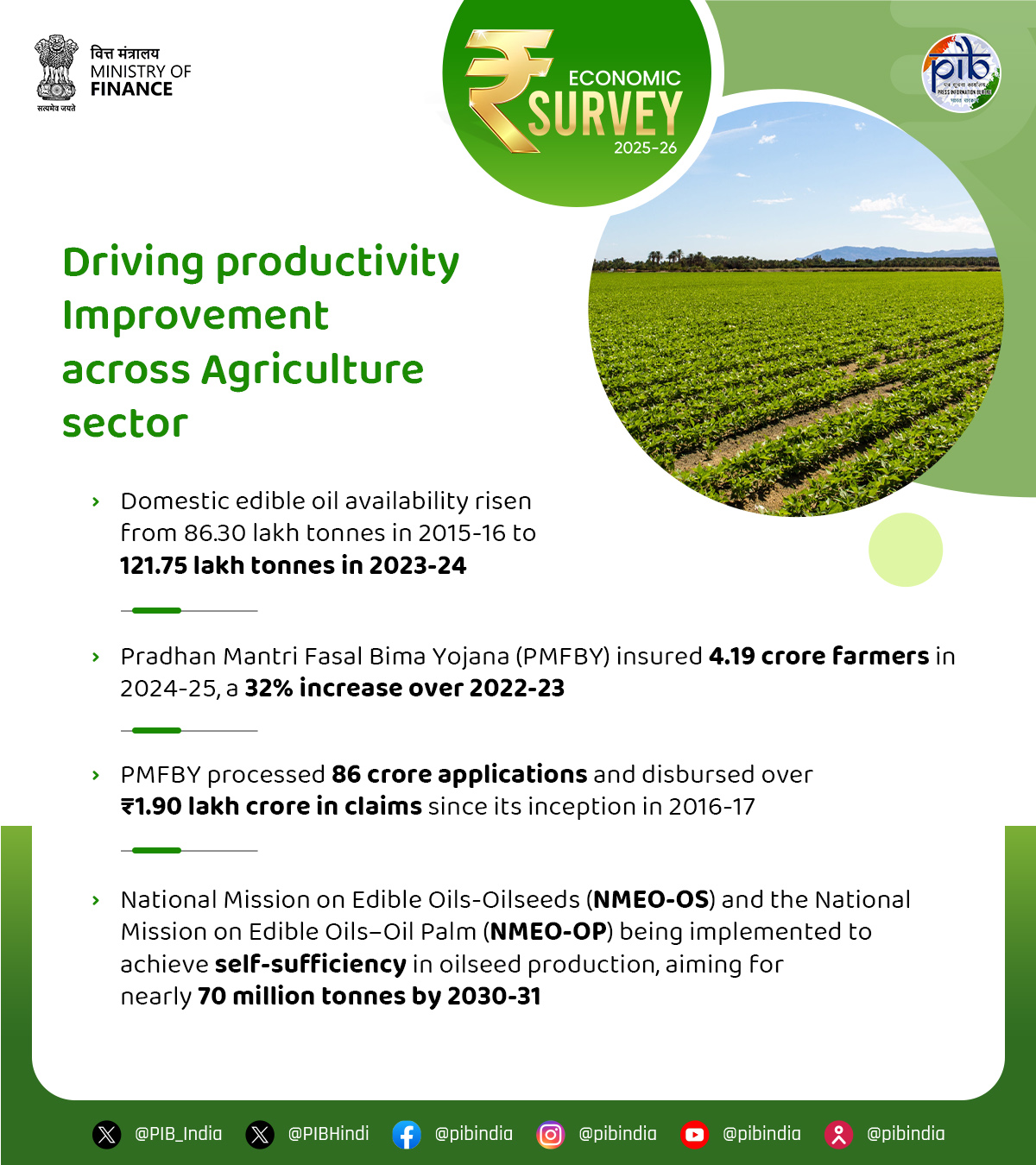 કૃષિ ઇનપુટ ગુણવત્તા, ફાર્મ મિકેનાઇઝેશન, માર્કેટ સપોર્ટ, પાક વીમો અને ધિરાણમાં વધારો વિશાળ સકારાત્મક પરિણામો તરફ દોરી જાય છે: આર્થિક સર્વેક્ષણ
