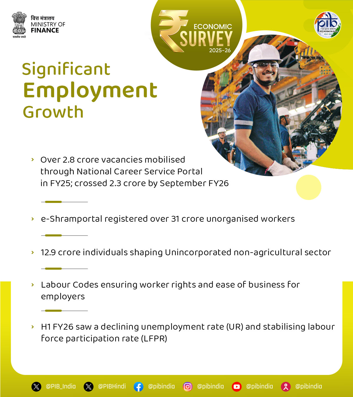RIGHT SKILLING, ENTREPRENEURIAL SPIRIT AND GOVERNMENT INITIATIVES CONTINUE TO BRING DOWN UNEMPLOYMENT, SAYS THE ECONOMIC SURVEY 2025-26