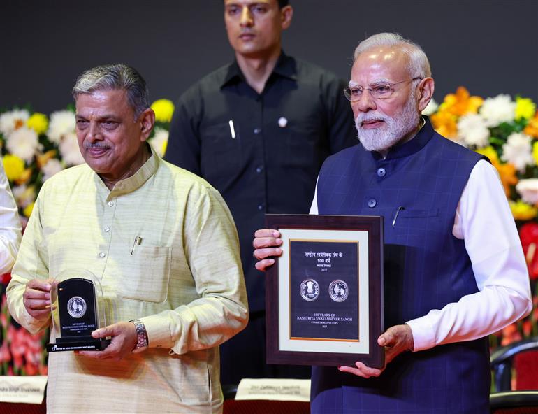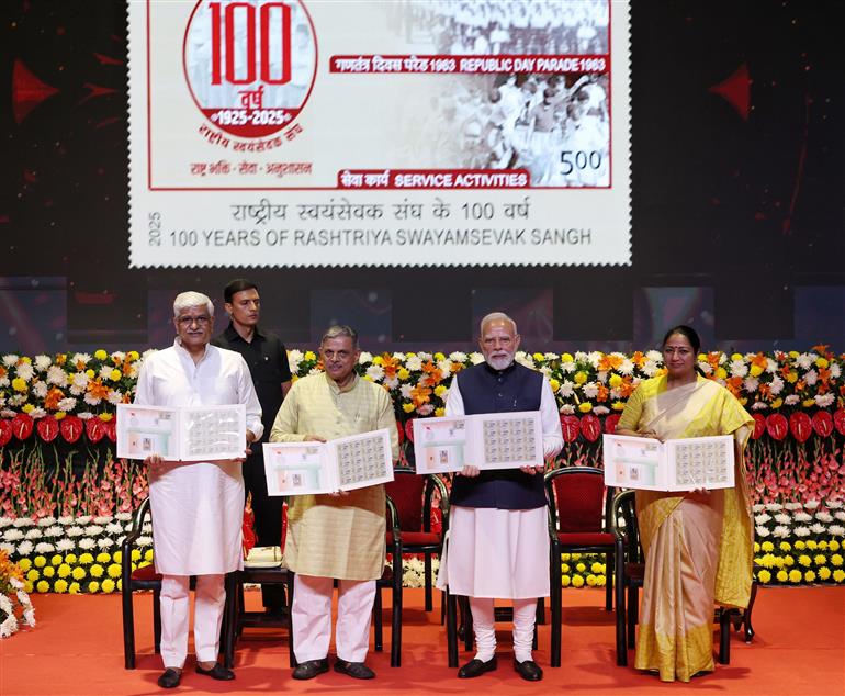 PM participates in the centenary celebrations of the Rashtriya Swayamsevak Sangh, in New Delhi on October 01, 2025.
