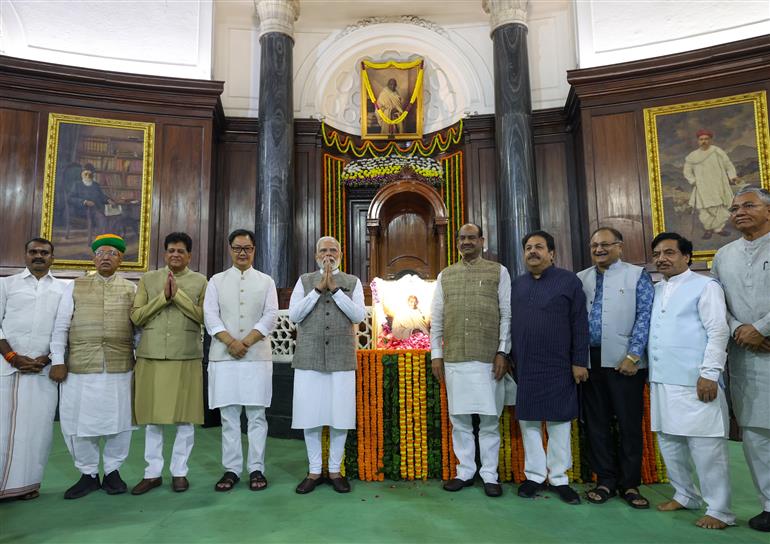 PM paying homage to Mahatma Gandhi on the occasion of Gandhi Jayanti at Parliament House, in New Delhi on October 02, 2025.