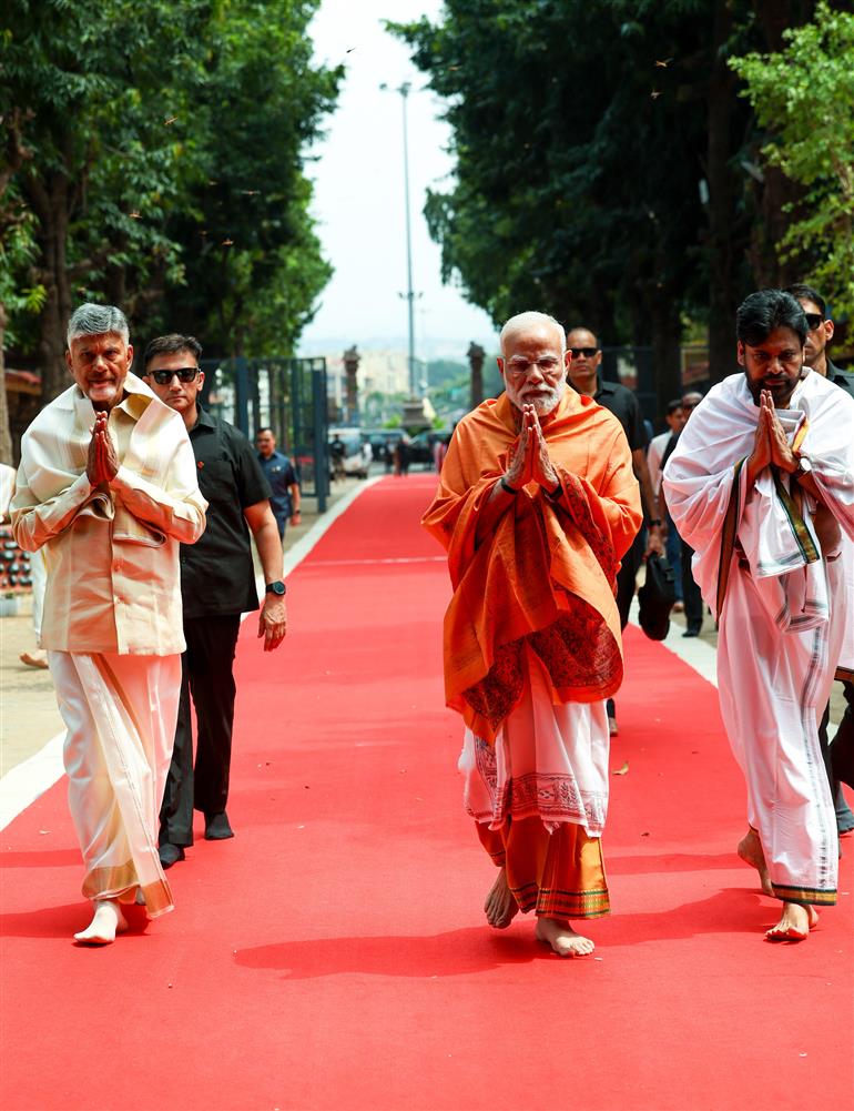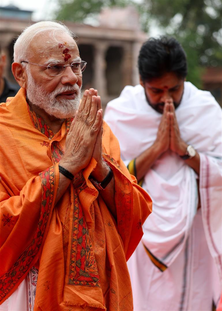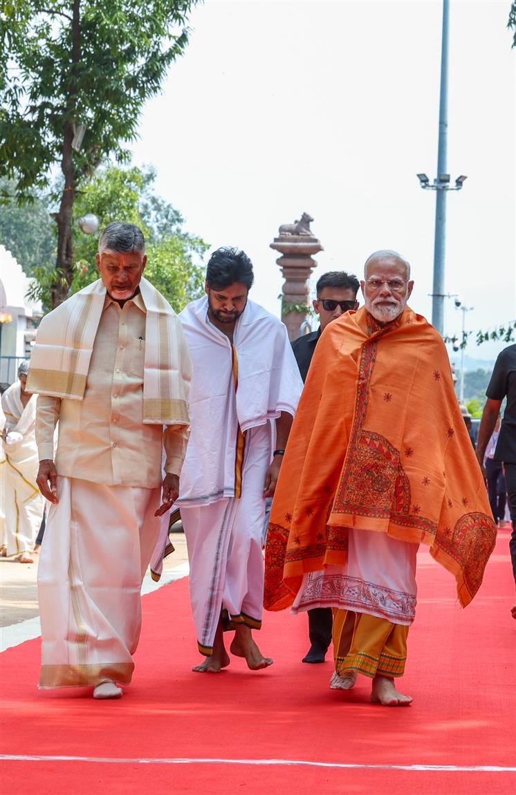 PM performs Darshan and Puja at Sri Bhramaramba Mallikarjuna Swamy Varla Devasthanam at Srisailam, in Andhra Pradesh on October 16, 2025.