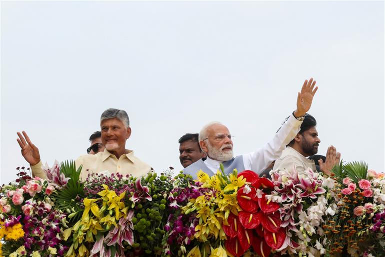 PM receives warm welcome by enthusiastic crowd during the Grand Road Show on his arrival at Srisailam, in Andhra Pradesh on October 16, 2025.