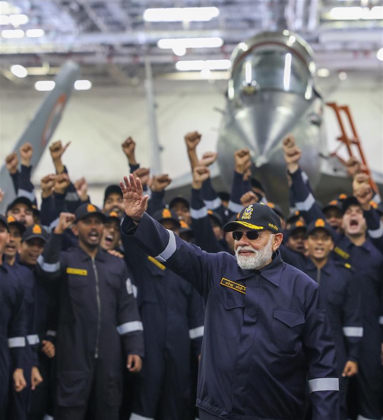 PM arrived on the sidelines of Diwali celebration at INS Vikrant on October 20, 2025.